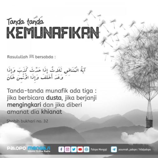 Daripada [Abu Hurairah رَضِيَ اللّٰهُ عَنْهُ] daripada Nabi ﷺ, baginda bersabda: “Tanda-tanda munafik ada tiga; jika berbicara dusta, jika berjanji mengingkari dan jika diberi amanat dia khianat”.