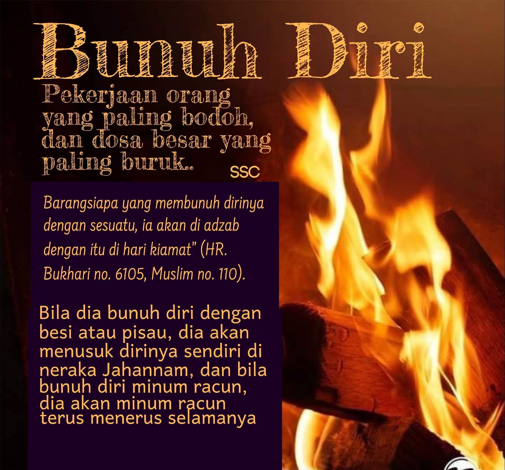 “Sesiapa yang membunuh diri dengan besi, maka di neraka jahanam nanti besi itu selalu di tangannya, dia menusuk-nusukkannya ke perutnya selama-lamanya. Dan barangsiapa bunuh diri dengan meminum racun, maka di neraka jahanam nanti dia akan terus meminumnya selama-lamanya. Dan barangsiapa bunuh diri dengan menjatuhkan diri dari gunung, maka di neraka jahanam nanti, dia akan menjatuhkan (dirinya) selama-lamanya.”