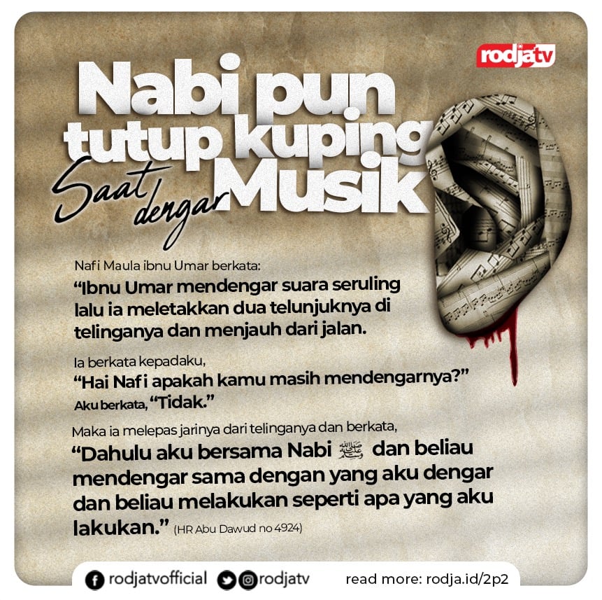 Ibnu ‘Umar رَضِيَ اللَّهُ عَنْهُمَا pernah mendengar suara seruling daripada seorang pengembala, lalu beliau menyumbat kedua telinganya dengan kedua jarinya. Kemudian beliau berpindah ke jalan yang lain. Lalu Ibnu ‘Umar رَضِيَ اللَّهُ عَنْهُمَا berkata, “Wahai Nafi’, apakah kamu masih mendengar suara tadi?” Aku (Nafi’) berkata, “Ya, aku masih mendengarnya.” Kemudian, Ibnu ‘Umar رَضِيَ اللَّهُ عَنْهُمَا terus berjalan. Lalu, aku berkata, “Aku tidak mendengarnya lagi.” Barulah setelah itu Ibnu ‘Umar رَضِيَ اللَّهُ عَنْهُمَا melepaskan tangannya daripada telinganya dan kembali ke jalan itu lalu berkata, “Beginilah aku melihat Rasulullah ﷺ ketika mendengar suara seruling daripada seorang pengembala. Baginda melakukannya seperti tadi.”