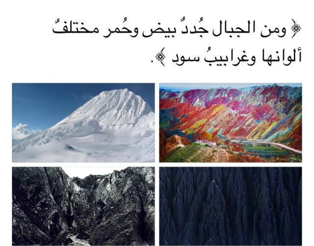 وَمِنَ الجِبالِ جُدَدٌ بيضٌ وَحُمرٌ