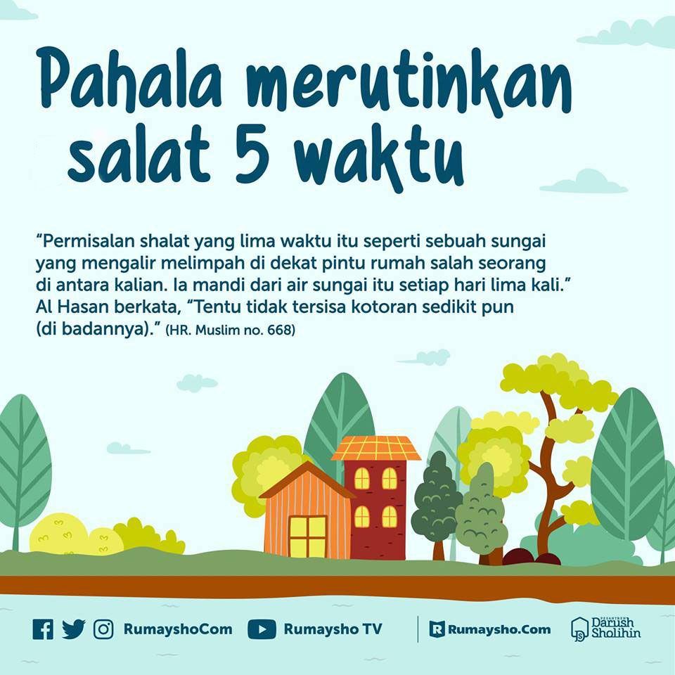 Daripada [Abu Hurairah رَضِيَ اللّٰهُ عَنْهُ], bahawa dia mendengar Rasulullah ﷺ bersabda: “Bagaimana pendapat kalian seandainya ada sungai di depan pintu rumah salah seorang daripada kalian, lalu dia mandi lima kali setiap hari? Apakah kalian menganggap masih akan ada kotoran (daki) yang tersisa padanya?” Para sahabat menjawab, “Tidak akan ada yang tersisa sedikit pun kotoran padanya.” Lalu baginda bersabda: “Seperti itu pula dengan solat lima waktu, dengannya Allah akan menghapus semua kesalahan.”