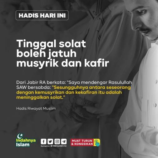 Daripada Abu Sufyan رَضِيَ اللّٰهُ عَنْهُ beliau berkata, saya mendengar Jabir رَضِيَ اللّٰهُ عَنْهُ berkata, “Aku mendengar Nabi ﷺ bersabda: “Sungguh, yang memisahkan antara seorang laki-laki dengan kesyirikan dan kekufuran adalah meninggalkan solat’.”