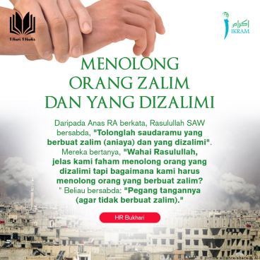 Daripada Anas رَضِيَ اللّٰهُ عَنْهُ berkata; Rasulullah ﷺ bersabda: ‘Tolonglah saudaramu yang berbuat zalim (aniaya) dan yang dizalimi”. Mereka bertanya: “Wahai Rasulullah, jelas kami faham menolong orang yang dizalimi tapi bagaimana kami harus menolong orang yang berbuat zalim?” Baginda bersabda: “Pegang tangannya (agar tidak berbuat zalim) “.