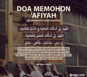 “Ya Allah, sesungguhnya aku betul-betul memohon kepada-Mu maaf, dan ‘afiyat di dunia dan akhirat. Ya Allah, sesungguhnya aku betul-betul memohon kepada-Mu maaf dan ‘afiyat pada agamaku, keluargaku dan hartaku…”