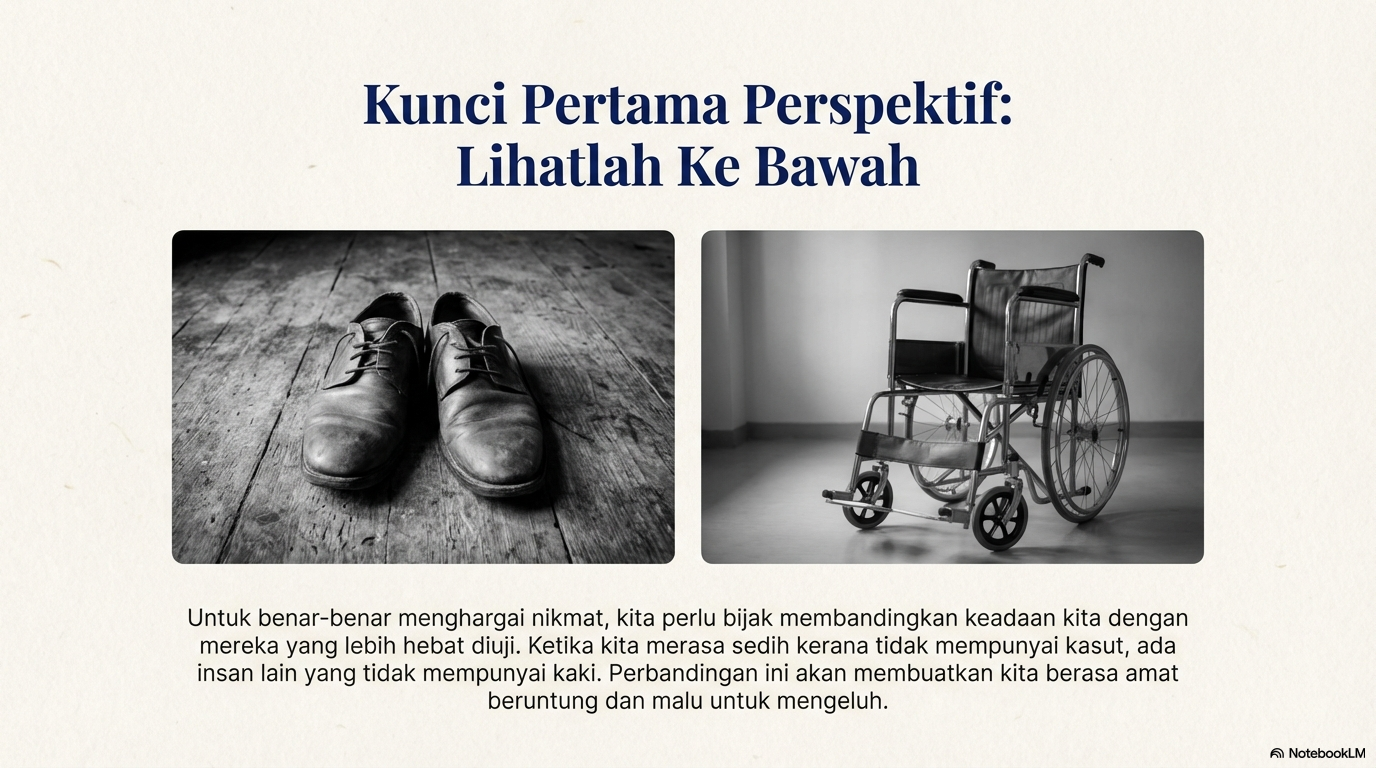 Namun begitulah masalahnya dengan manusia, asyik pandang masalah sahaja. Sedangkan kalaulah dia bandingkan masalah yang sedang dialaminya itu dengan masalah orang lain, tentu dia akan malu tersipu-sipu sendiri yang masalah dia itu kecil molek sahaja. Dalam dia tidak dapat makan, ada orang lain tidak ada makanan; kalau dia tidak ada kasut, orang lain tidak ada kaki! Memang begitulah kalau hendak menghargai nikmat yang Allah ﷻ berikan, kena pandai melihat kepada orang yang lebih teruk diuji daripada kita. Waktu tu memang kita akan berasa sangat beruntung! Kalau nak lagi mantap perasaan ini, melawat lah ke hospital maka anda akan dapati ramainya orang yang sakit.