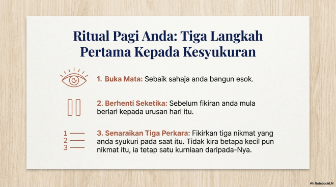 Homework: bermula esok, buka mata saja terus fikirkan tiga perkara yang anda bersyukur. Tidak kiralah betapa kecil pun nikmat itu kerana ia adalah tetap nikmat. Akan tetapi manusia sering mengejar-ngejar nikmat yang sukar didapati seperti duit berjuta, sedangkan mereka lupa ada nikmat yang lebih hebat yang telah ada pada mereka. Sebagai contoh, nikmat mata. Sanggupkah anda menukar mata anda itu dengan sebuah istana? Tentu tidak, bukan? Sedarlah bahawa pada fizikal diri kita ini sendiri sudah ada terlalu banyak nikmat yang boleh disyukuri. Allah ﷻ berfirman di dalam Dzariyat:21
