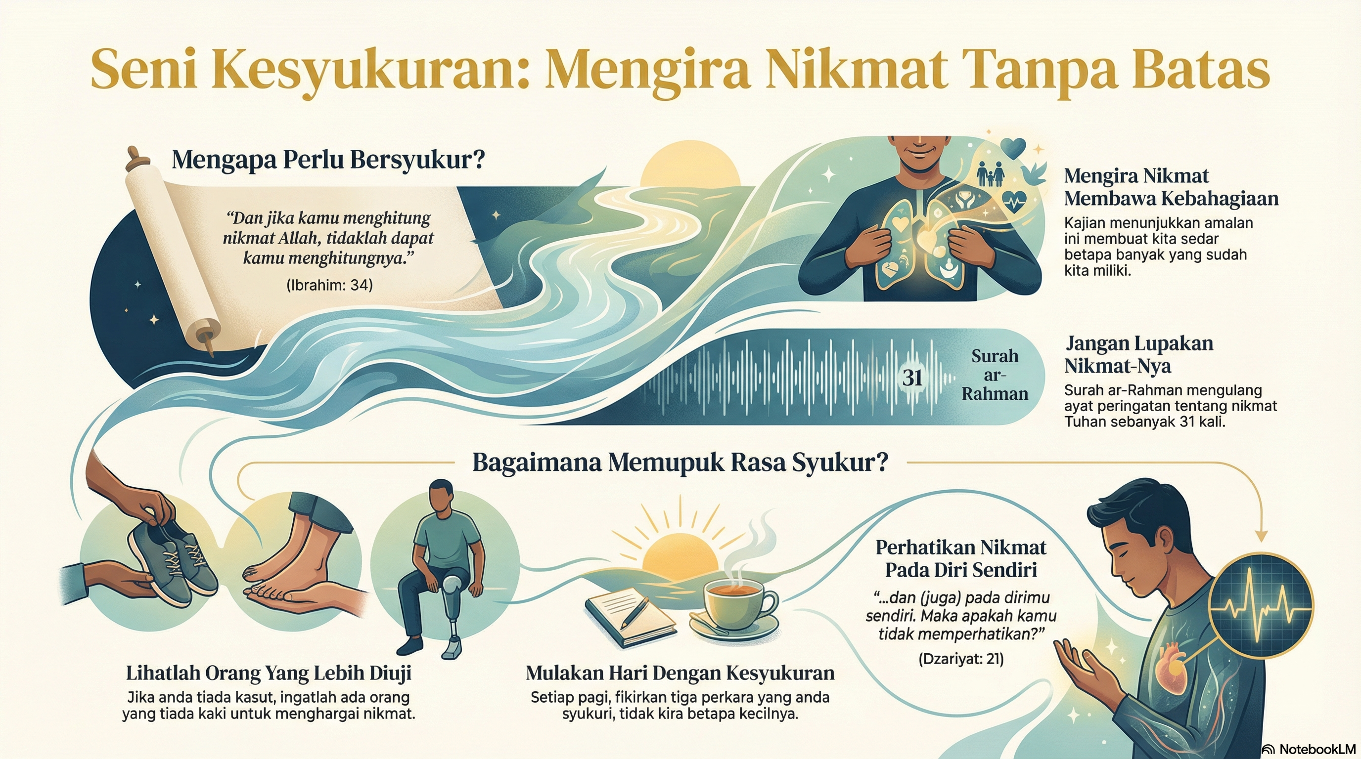 Memang kita tidak akan dapat menghitung kesemuanya, tetapi hitunglah setakat yang kita mampu. Kajian menunjukkan sekiranya kita menghitung segala nikmat (count our blessings), hasilnya ia akan menggembirakan kita. Kerana barulah kita sedar, ‘Oh banyak juga benda-benda aku sudah ada, jadi kenapa nak fokuskan sangat kepada masalah yang sedikit ini?’ Allah ﷻ ulang 31 kali di dalam Surah ar-Rahman: