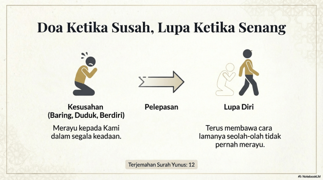 Dan apabila seseorang manusia ditimpa kesusahan, merayulah dia kepada Kami (dalam segala keadaan), sama ada dia sedang berbaring atau duduk ataupun berdiri; dan manakala Kami hapuskan kesusahan itu daripadanya, dia terus membawa cara lamanya seolah-olah dia tidak pernah merayu kepada Kami memohon hapuskan sebarang kesusahan yang menimpanya (sebagaimana dia memandang eloknya bawaan itu) demikianlah diperelokkan pada pandangan orang-orang yang melampau apa yang mereka lakukan.