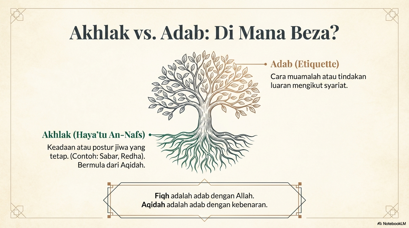 • Adab (أدب): Cara melakukan sesuatu atau bermuamalah mengikut ketetapan syariat. Ia adalah manifestasi luaran daripada akhlak.