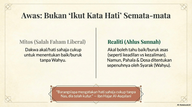 Jadi kena faham hal ini dan jangan bermudah-mudah membuat hukum, Ada yang telah membuat kesalahan ini seperti seminar ESQ yang pernah terkenal suatu ketika dahulu. Antara pemikiran ESQ masa itu ialah mereka kata manusia ini ada kemampuan mengetahui baik dan buruk dengan hati sahaja, Maka mereka mengajar peserta mereka untuk berfatwa kepada hati sahaja. Maka ini adalah fahaman yang salah seperti yang telah disebutkan oleh Ibn Hajar tadi. Kerana hati sahaja tidak cukup. Memang fitrah manusia dia nakkan kebaikan. Di dalam satu hadis yang diriwayatkan daripada Huzaifah bin Al-Yaman, beliau berkata: