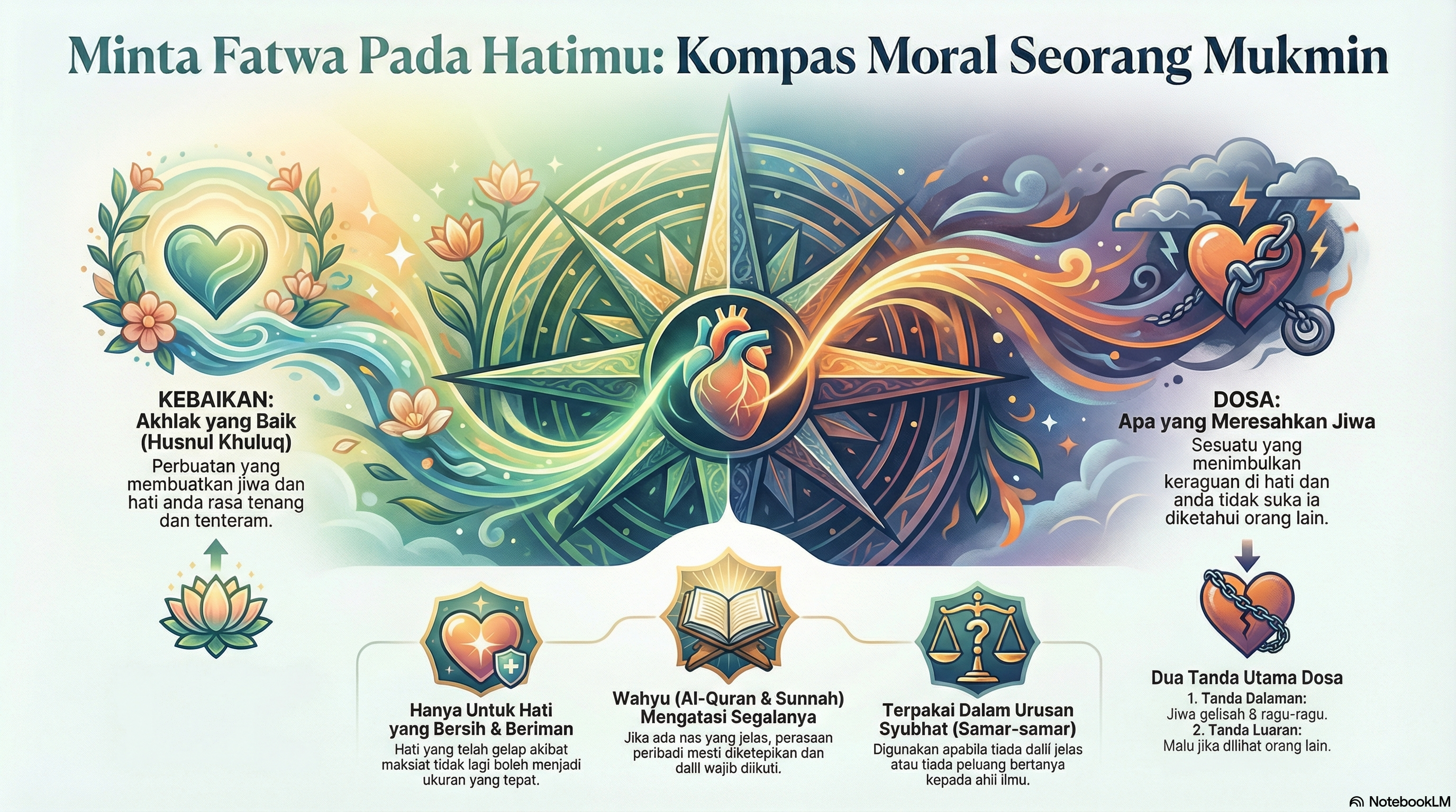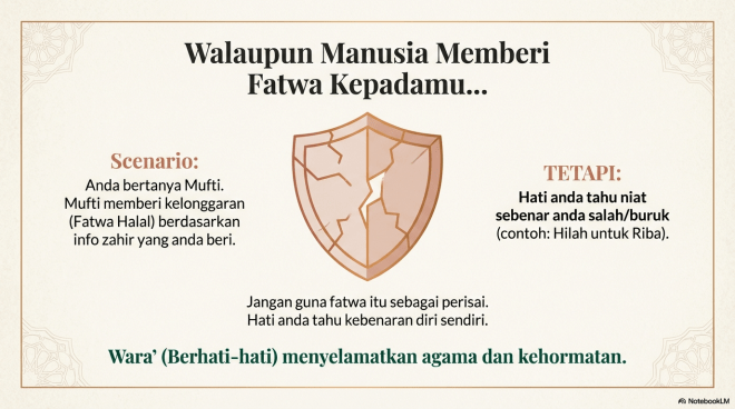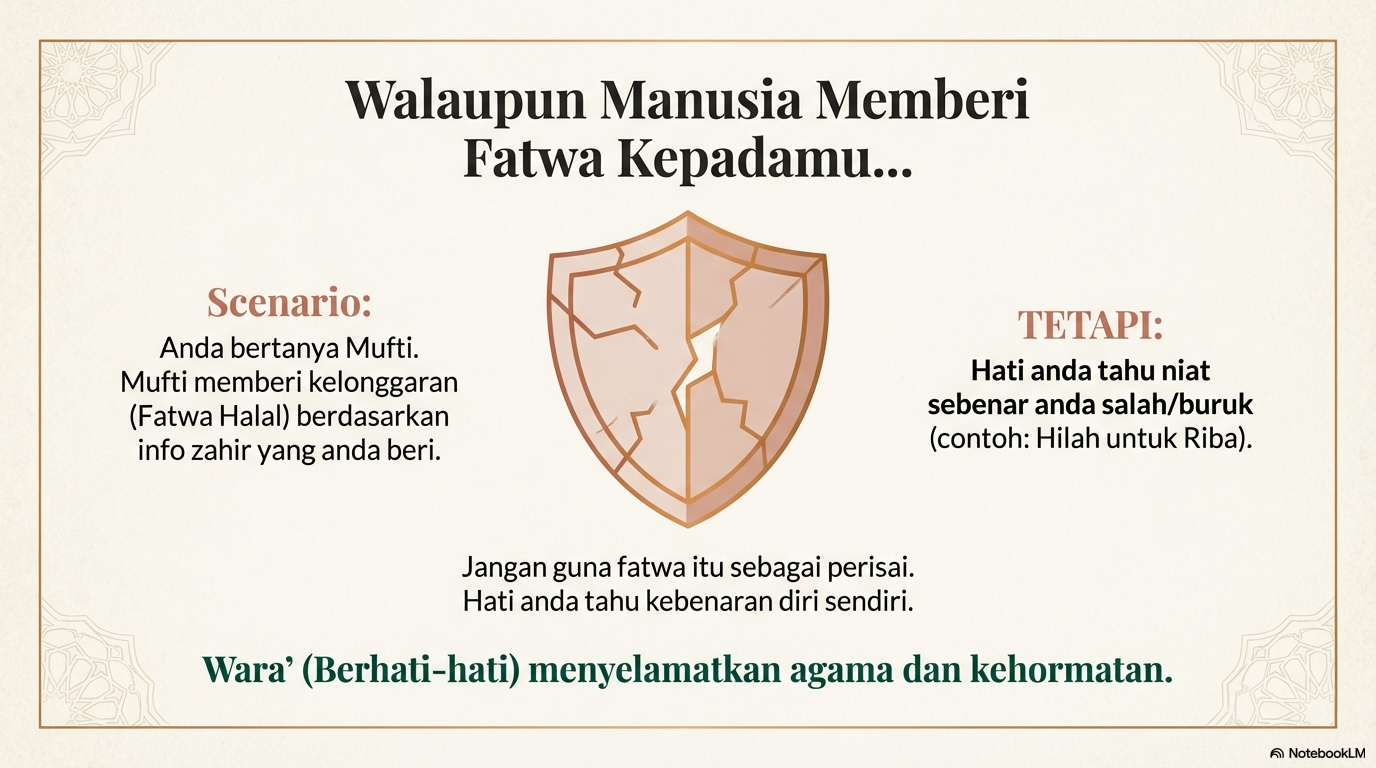 Kesimpulannya: Hadis ini adalah panduan moral untuk ketenteraman jiwa (psikologi mukmin) dalam menghadapi perkara yang meragukan, dan bukannya alat untuk mencipta hukum sendiri atau mengetepikan hukum syarak yang sudah tetap.