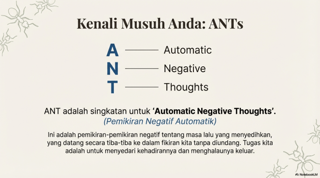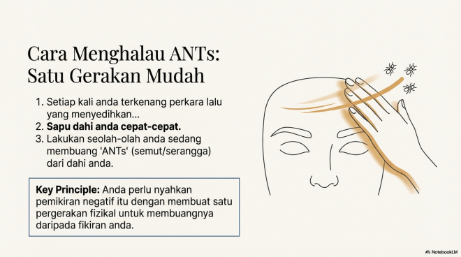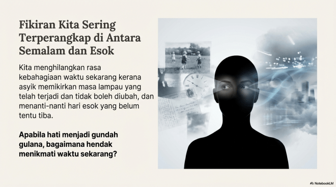 Benar sekali kata-kata ini. Kita menghilangkan rasa kebahagiaan waktu sekarang kerana asyik memikirkan masa lampau dan takut menghadapi masa hadapan. Apabila hati menjadi gundah gulana, bagaimana hendak menikmati waktu sekarang? Maka kita harus belajar mencontohi sikap kanak-kanak. Lihatlah mereka bergembira sahaja kerana mereka belum pandai untuk risau hal semalam dan merancang hari esok. Contohnya begini, anda sedang makan akan tetapi sedang sibuk memikirkan kerja kerana mungkin ada masalah besar yang sedang dihadapi. Tentulah kesedapan makanan itu tidak terasa. Hilang sudah satu nikmat yang Allah berikan, bukan? Malah pencernaan makanan pun menjadi tidak bagus.