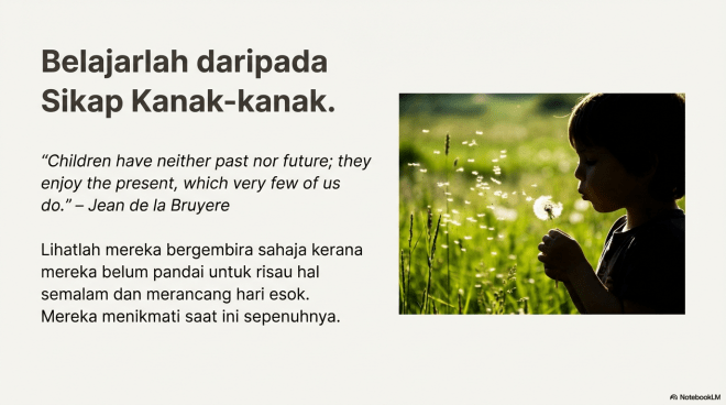 Ada pepatah yang saya suka: “Children have neither past nor future; they enjoy the present, which very few of us do“. – Jean de la Bruyere
