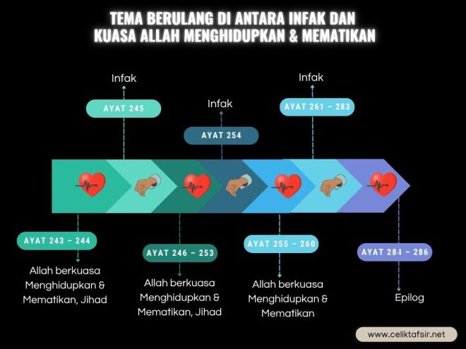Yang lebih menarik, Bahagian A’ ini kalau diperhatikan, ia berulang-ulang topik di antara menyebut kuasa Allah ‎ﷻ di dalam menghidupkan dan mematikan dengan infak. Ini menunjukkan kaitan antara dua perkara ini. Allah ‎ﷻ mengingatkan yang kita semua pasti mati dan akan dihidupkan kembali; dan perkara yang akan menyelamatkan kita setelah kita dihidupkan semula di akhirat adalah infak. Perhatikan susunan ini: