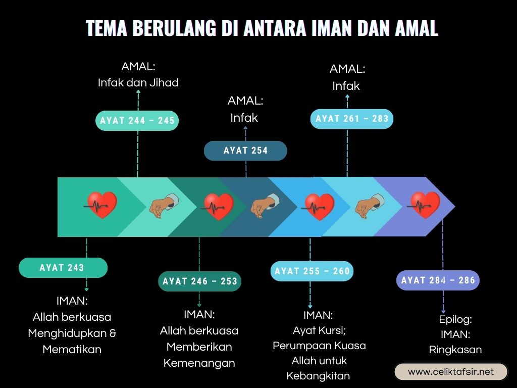 Bukan itu sahaja. Allah ‎ﷻ juga mengulang tema adalah iman dan amal. Ia mengajar kita yang iman ini bukan hanya di hati sahaja akan tetapi ia perlulah dibuktikan dengan perbuatan kita. Perhatikan susunan ini: