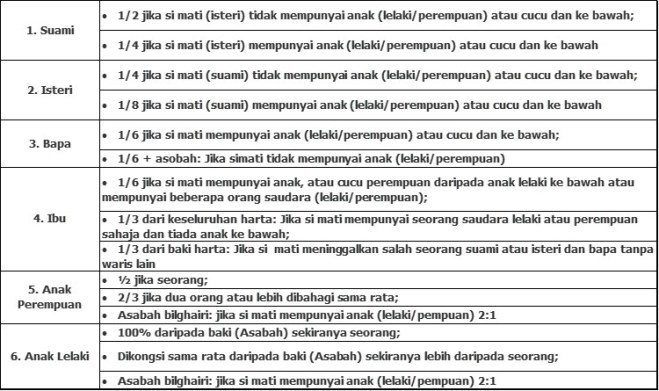 Antara yang perlu diambil kira dalam pembahagian harta pusaka ialah: